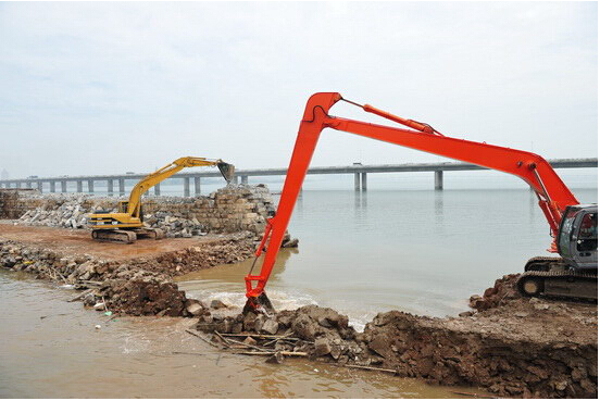 多臺挖掘機接下來(lái)將繼續海下挖掘,直至下挖至負6.95米,并將海堤開(kāi)口至800米寬,建成全長(cháng)1000米的雙幅連續箱梁橋。為了進(jìn)一步增強未來(lái)海堤集美側的水流交換能力,還將在集美側打開(kāi)一個(gè)210米的口子。